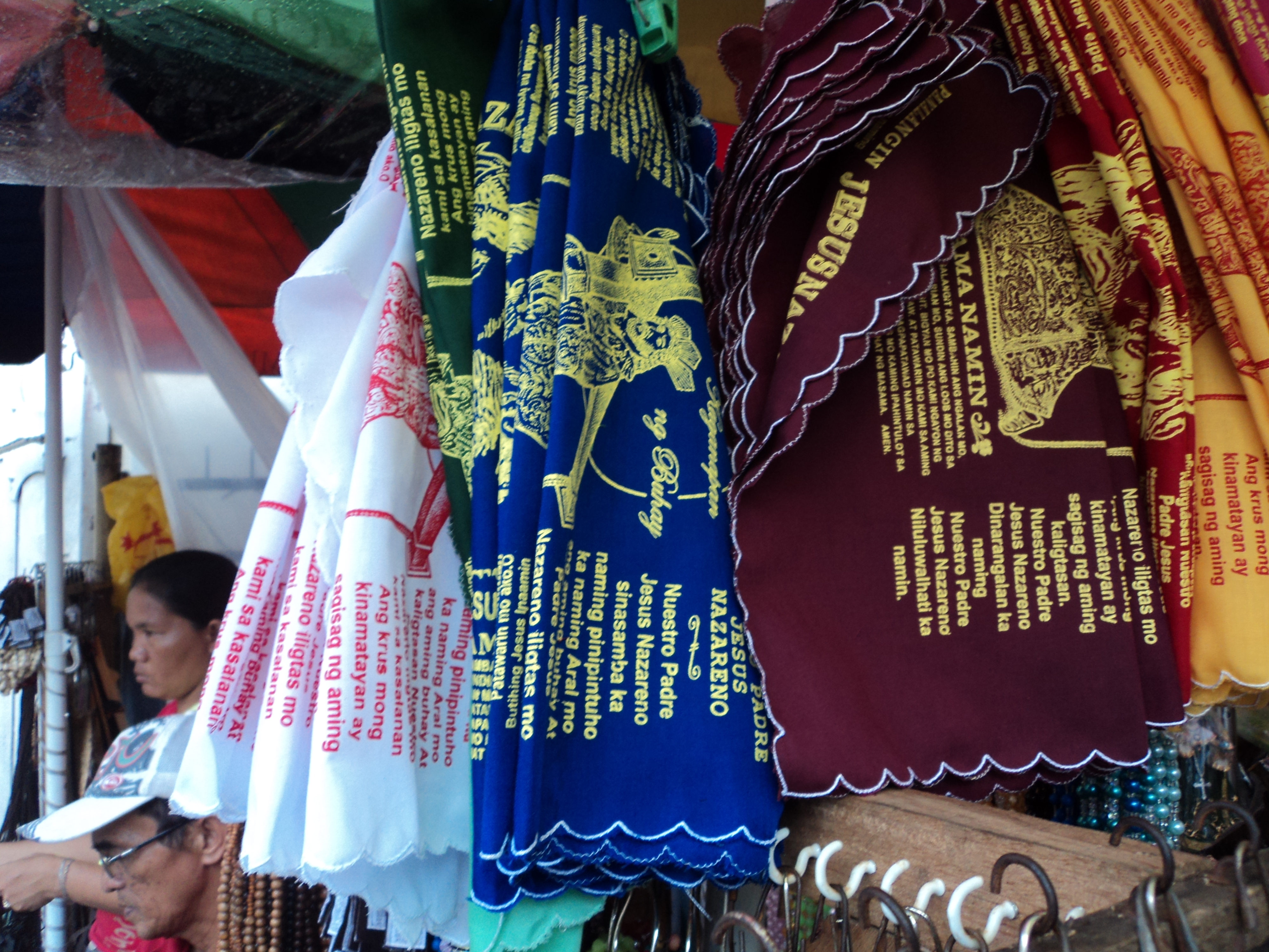 One can also find other religious artifacts around, such as handkerchiefs printed with prayers or Bible verses, sacramental medals, and of course, rosaries.