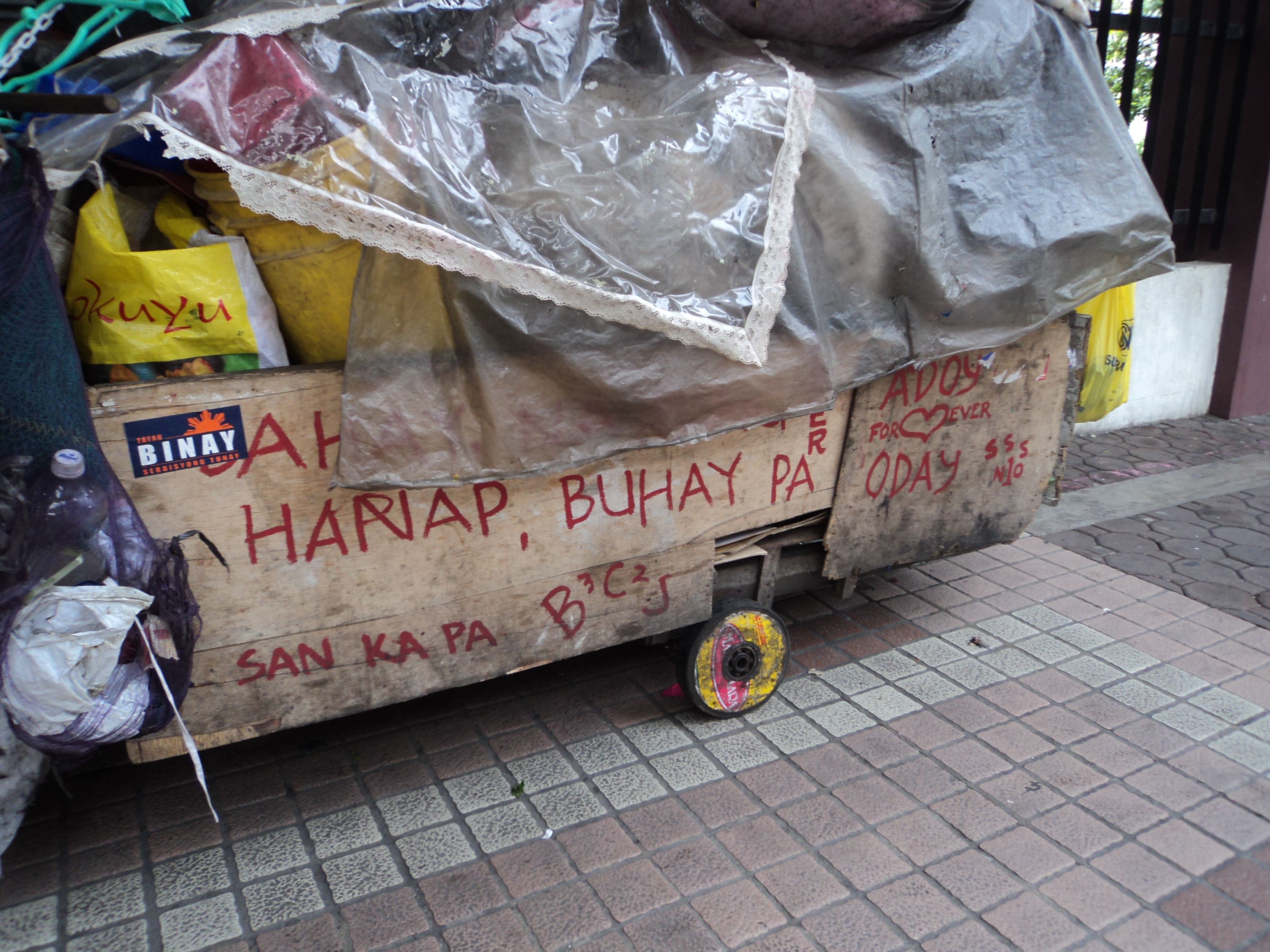 This kariton (pushcart) was being used by a homeless man as a shelter and a means of carrying scraps to sell at junkyards. The side of the kariton reads, very in tongue-in-cheek,