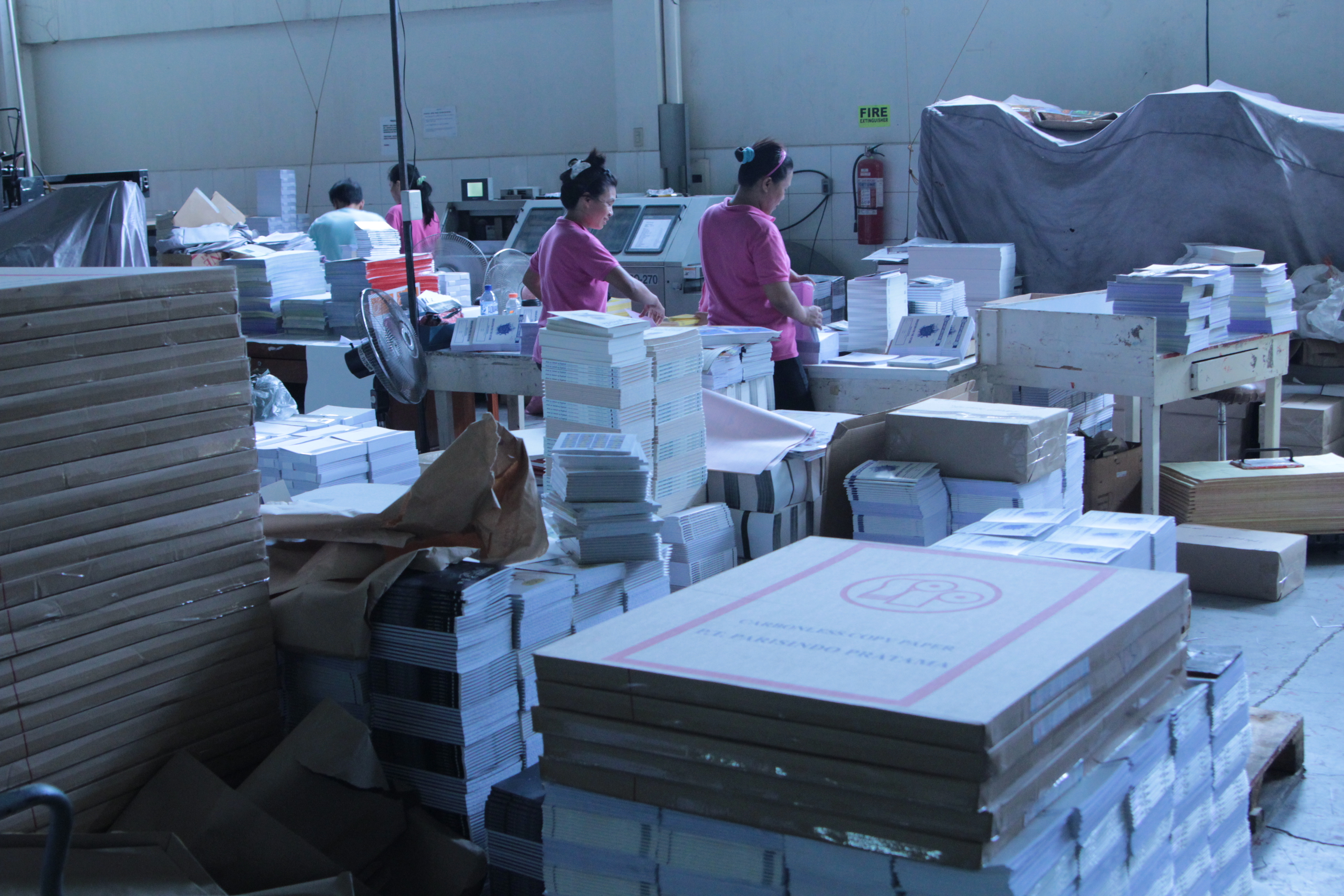 The printing press is full of employees working in an assembly line of production. Each station is manned, from proofing to printing to binding.